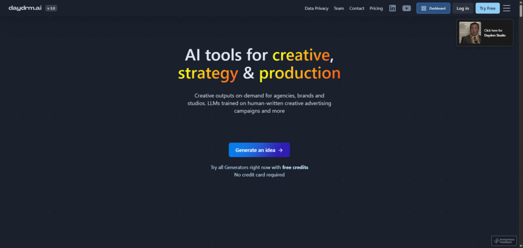 In essence, Daydrm.ai acts like a human creative partner—bridging strategy, creative concepting and campaign formats—so agencies can speed up ideation and focus more on refining and executing rather than starting from zero.