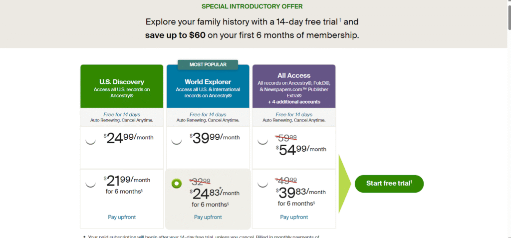 The free trial gives newcomers a risk-free way to explore features like basic tree-building, limited record searches, and some of the AI-powered tools.