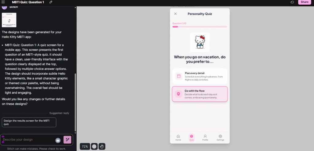 Even if you don’t know Figma, Stitch gives you functional UI screens that look realistic enough to test or validate ideas.